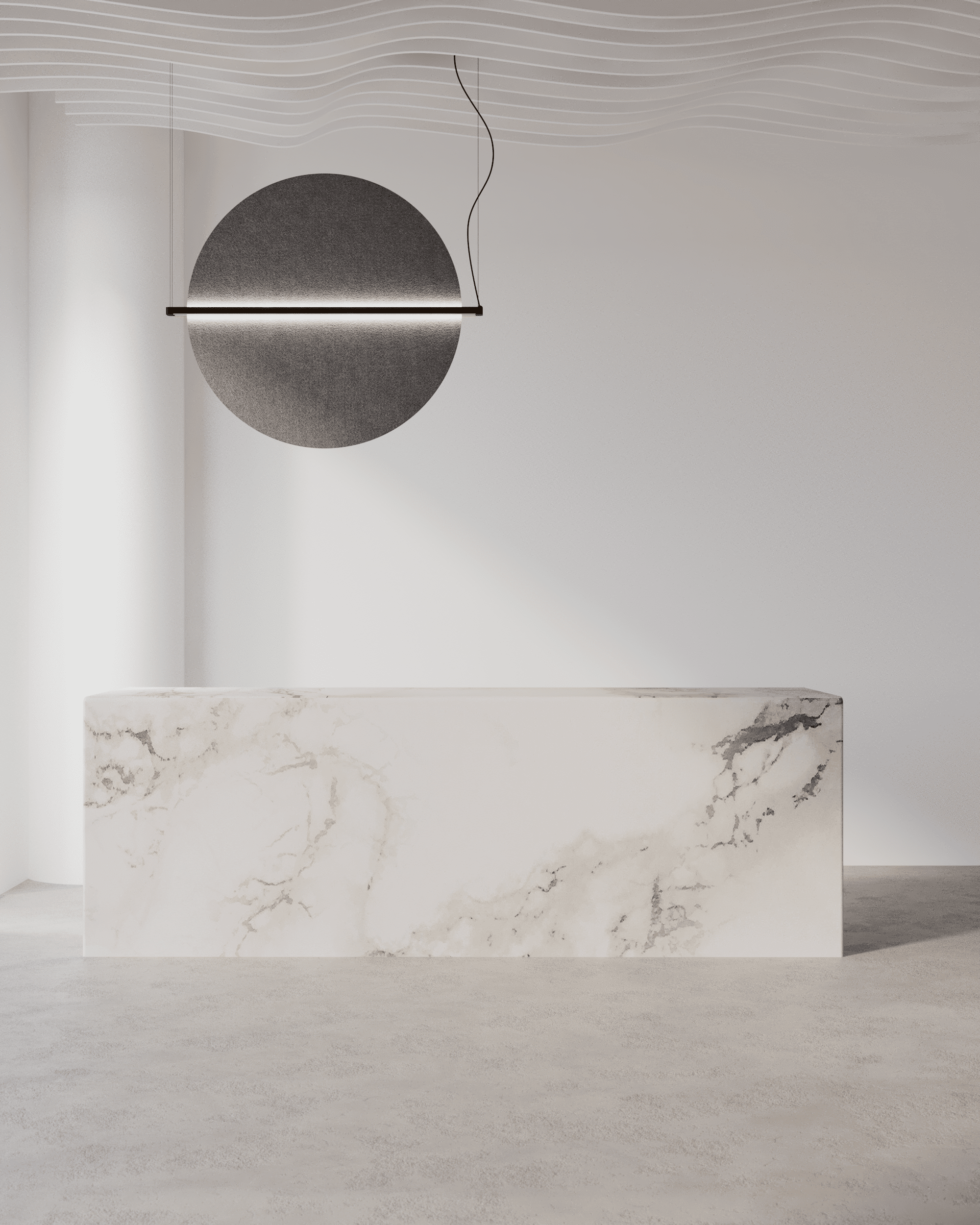 Minimalist and elegant, HORIZON Acoustic Lighting combines a striking circular design with dual functionality that transforms any space. The pendant features dual light output through an integrated LED system with an opal diffuser, while its acoustic PET felt surface actively absorbs sound to reduce reverberation and enhance speech clarity.