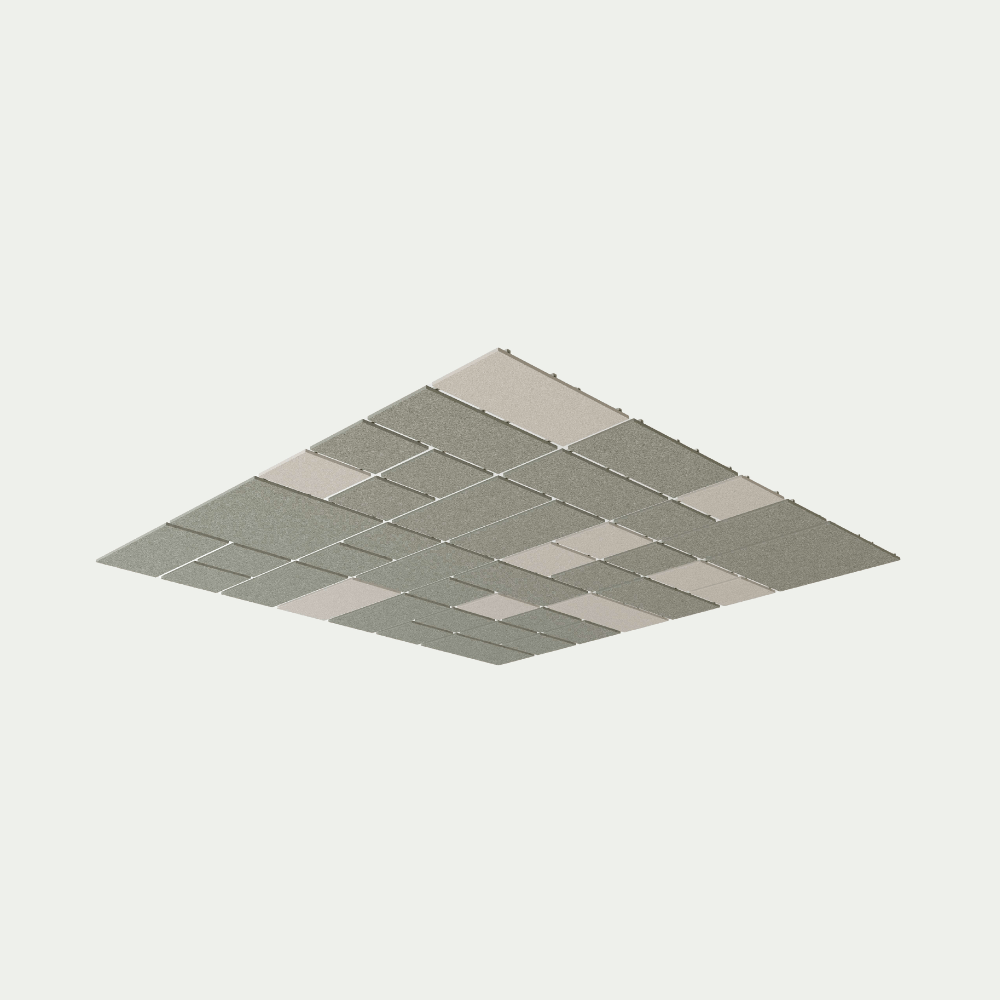 The Piet Ceiling Panel System by Impact Acoustic redefines overhead design with a bold, architectural approach to acoustic performance. Inspired by geometric abstraction, Piet uses a grid of three tile formats -Small, Medium, and Large-arranged in 1200 × 1200 mm clusters with precise 50 mm spacing. The result is a dynamic, pattern-rich ceiling that absorbs sound while adding rhythm and structure.