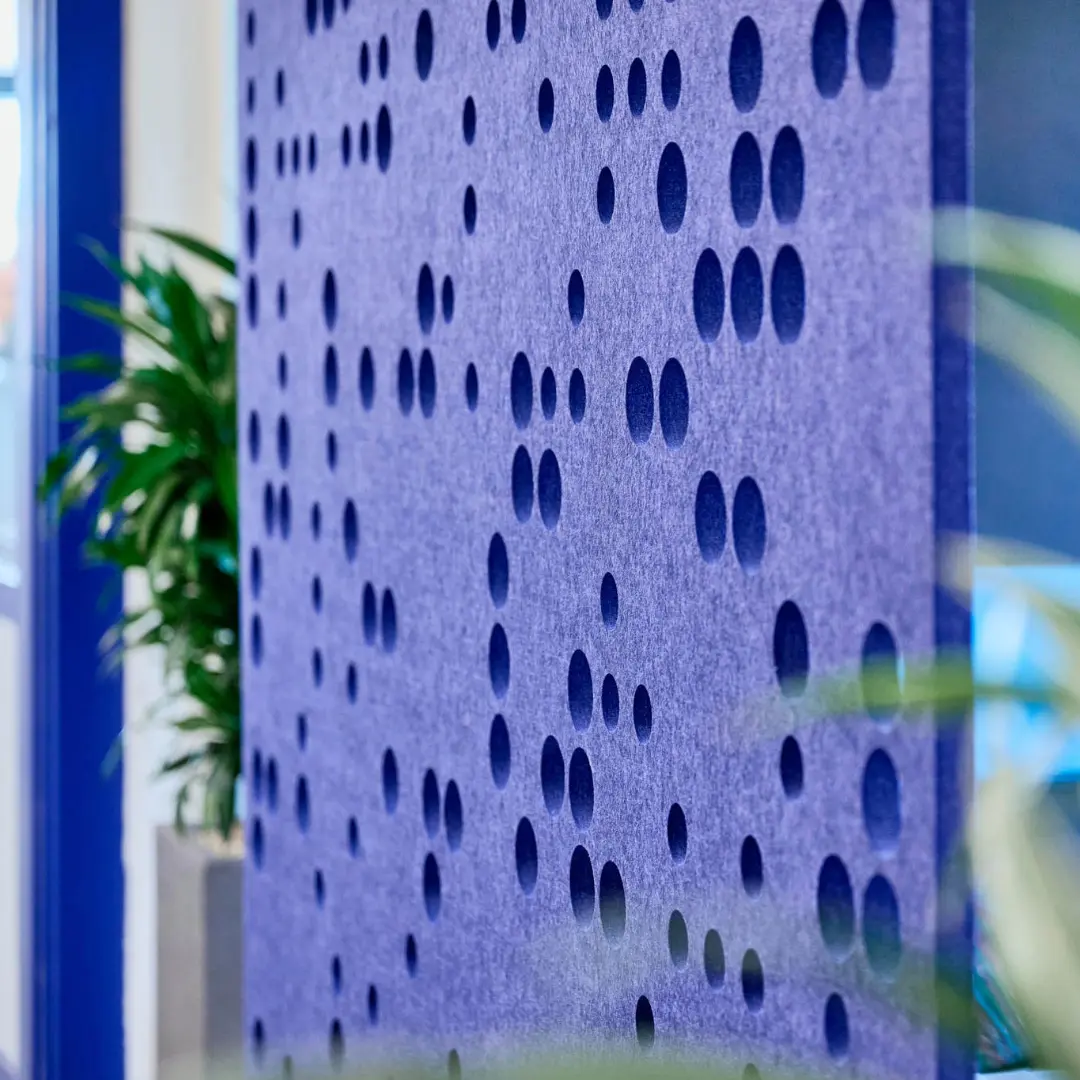 De harmonieuze verdeling van de ronde perforaties van de hangende akoestische roomdivider Braille is gebaseerd op de Delaunay-triangulatie.