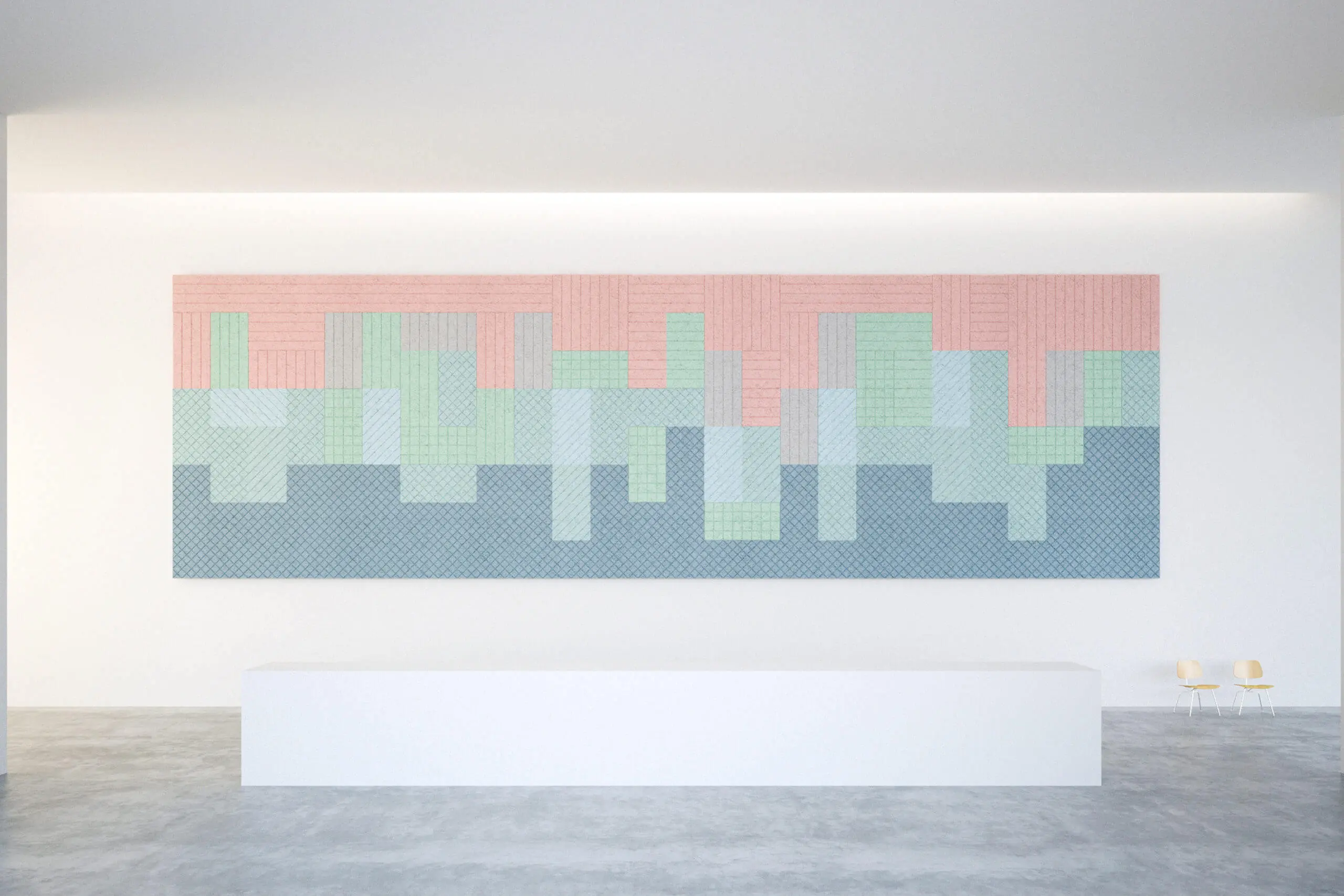 Dit milieuvriendelijke paneel is gemaakt van duurzame houtwol, cement en water en vermindert effectief het geluid terwijl het brandwerend, vochtbestendig en duurzaam is. Of het nu geïnstalleerd wordt als een uniform raster of gecombineerd wordt met andere BAUX panelen, het Check patroon versterkt de ruimtelijke structuur en het akoestisch comfort.