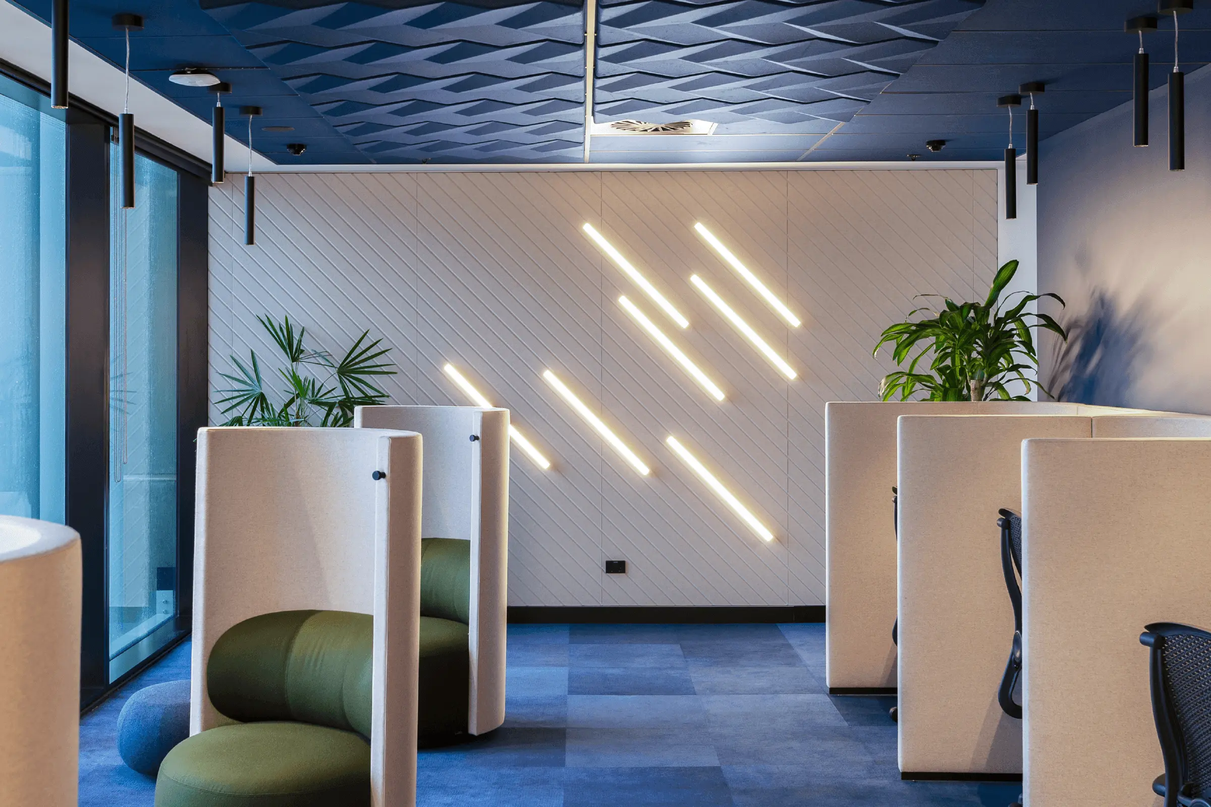 De nauwkeurig gesneden ontwerpen van Groove vangen en manipuleren licht en transformeren binnenruimtes met textuur, beweging en sfeer. Met opties zoals Peel 'n' Stick-achterkant ondersteunt Groove eenvoudige installatie en voldoet het aan de hoogste normen voor brandwerendheid (Klasse A, B-s2,d0), duurzaamheid (Rode Lijst Vrij, EPD-gecertificeerd, koolstofneutraal) en binnenluchtkwaliteit (lage VOS).