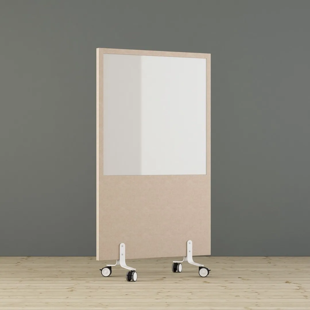 Lichaam: 15 mm geluidsabsorberend polyether (Oeko-Tex) verlijmd aan beide zijden van een 8 mm geluiddempende MDF-plaat (Nordic Ecolabel) met een recht frame van 40 mm. Magnetisch geschilderd schrijfbord in glas. Voet met wielen: Gepoedercoat wit 190 x 45 x 6 mm. *Recyclebare materialen.