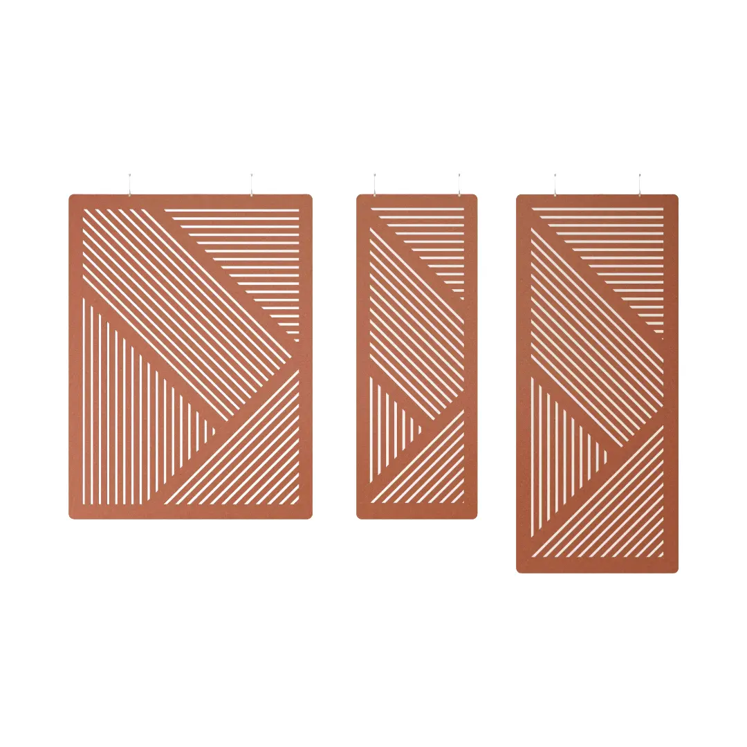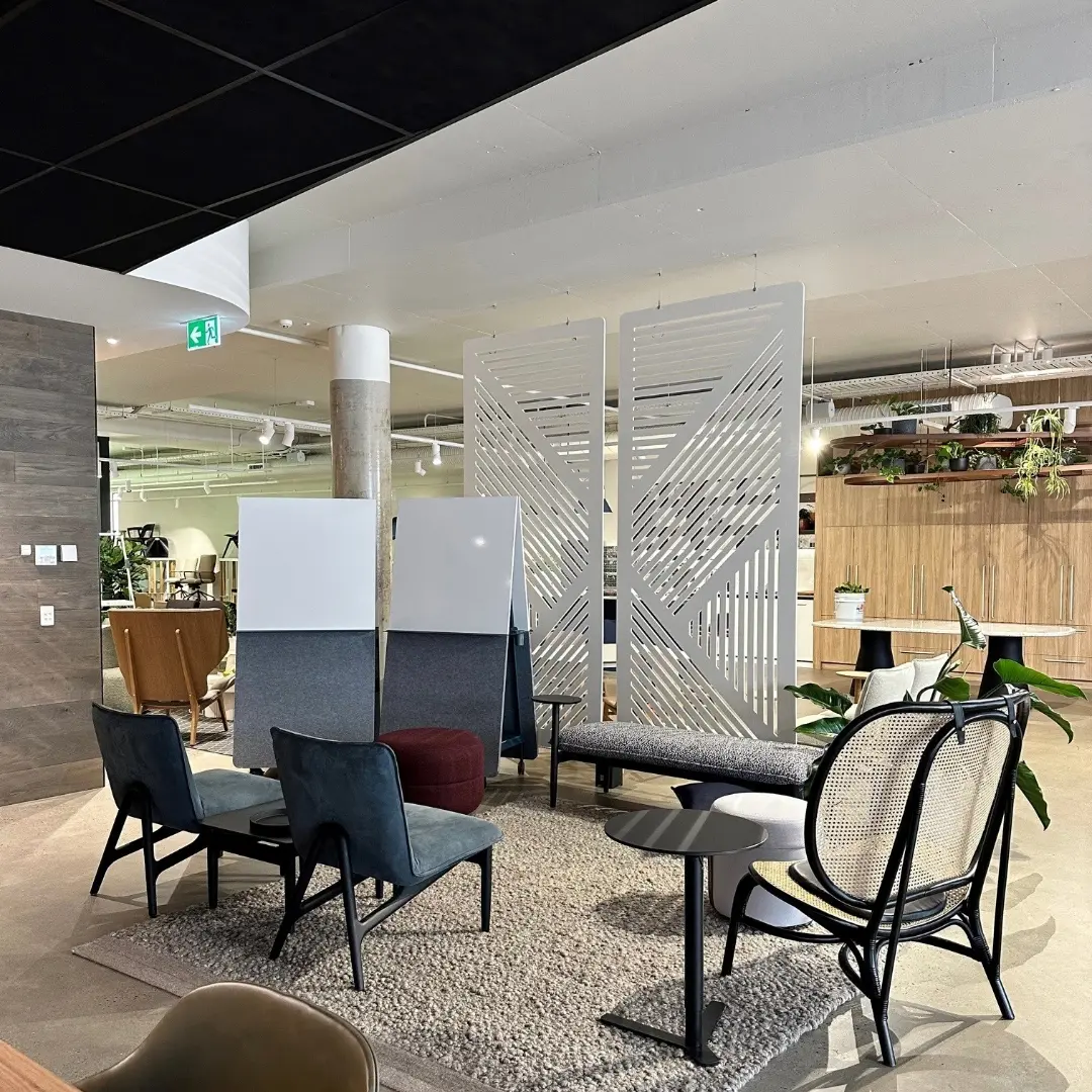De akoestische, hangende roomdivider Linea oogt filigraan (als een rasterwerk) en ontvouwt zijn effect van overlappende geometrie wanneer meerdere akoestische ruimteverdelers achter elkaar op een rail worden gehangen.