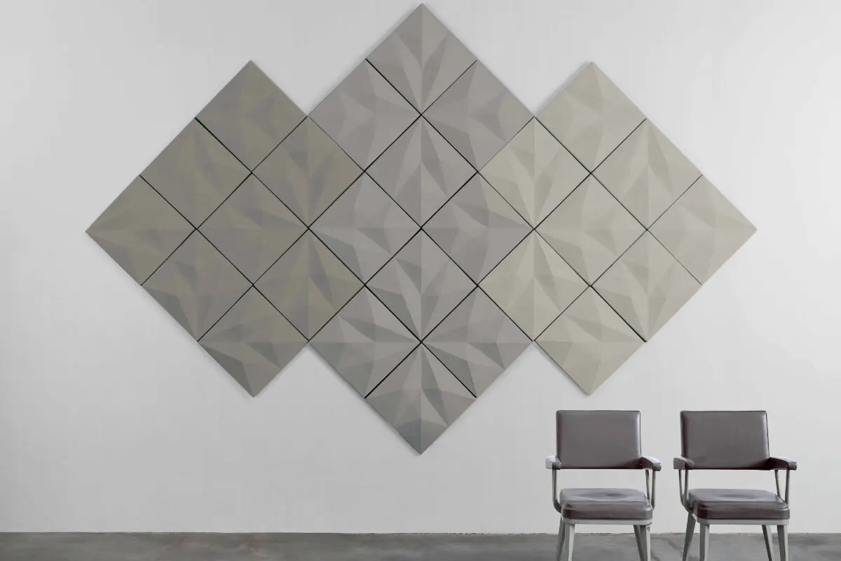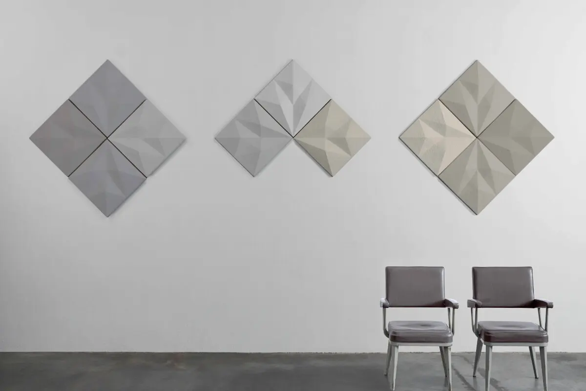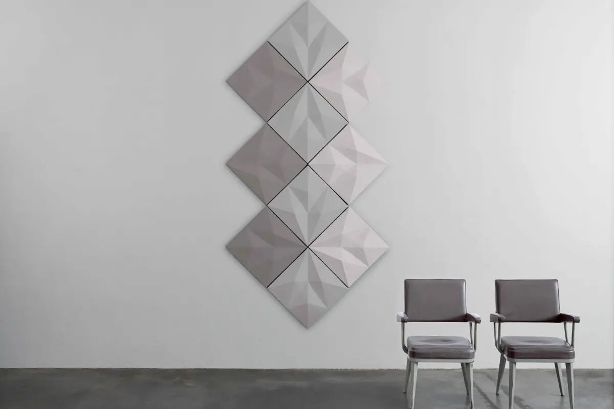 Het Kite Paneel verandert muren in dynamische kunstwerken, geïnspireerd door het samenspel van licht en de natuurlijke textuur van mycelium materialen. Met geometrische plooien die boeiende schaduwen en highlights werpen, vormt dit paneel een opvallend contrast met de zachtheid van Mogu-materialen, en biedt het zowel een visuele als akoestische aantrekkingskracht.