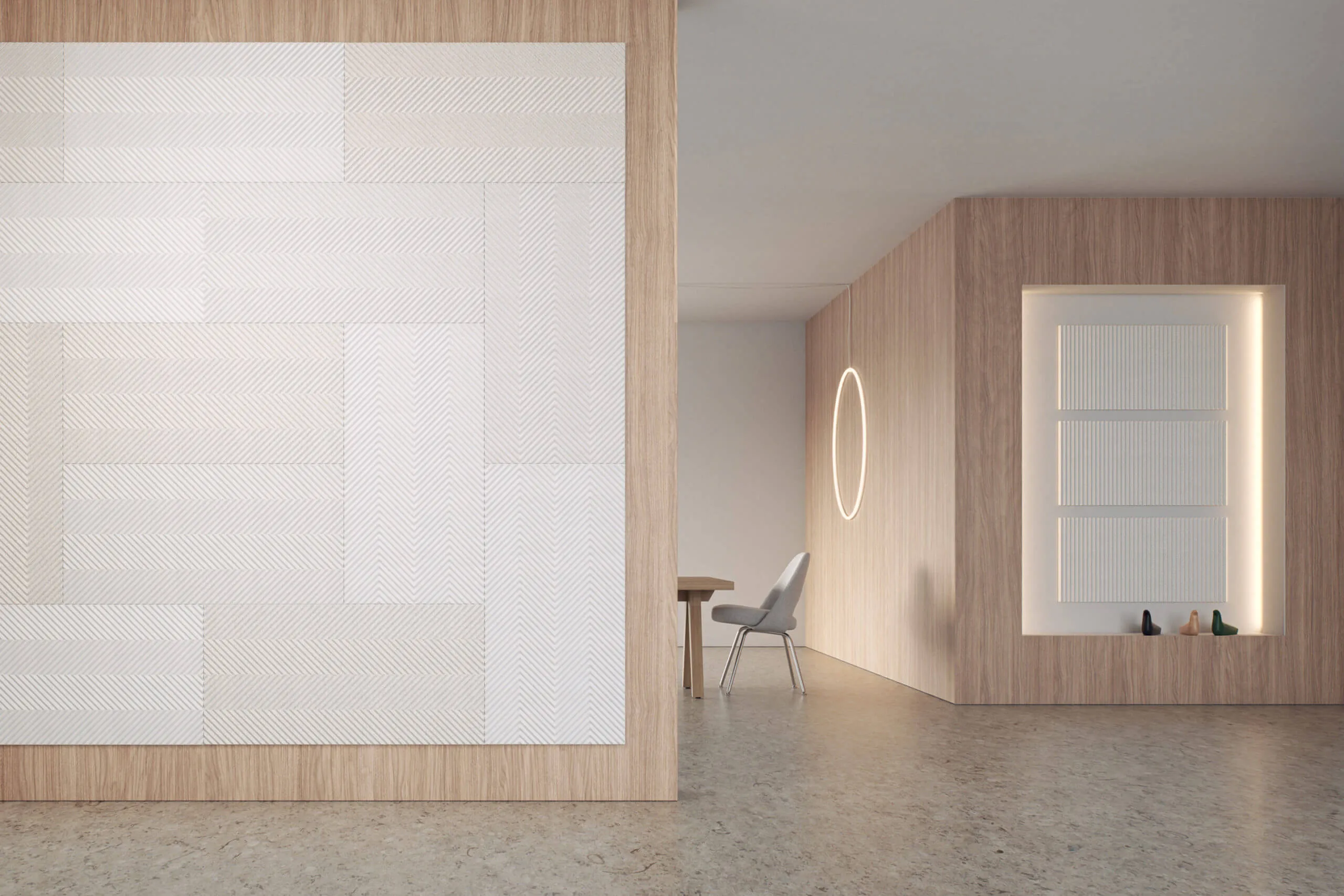 Transformeer je interieur met de BAUX Acoustic Pulp Origami Pulse Panelen, waar natuur en innovatie samenkomen in akoestisch design.