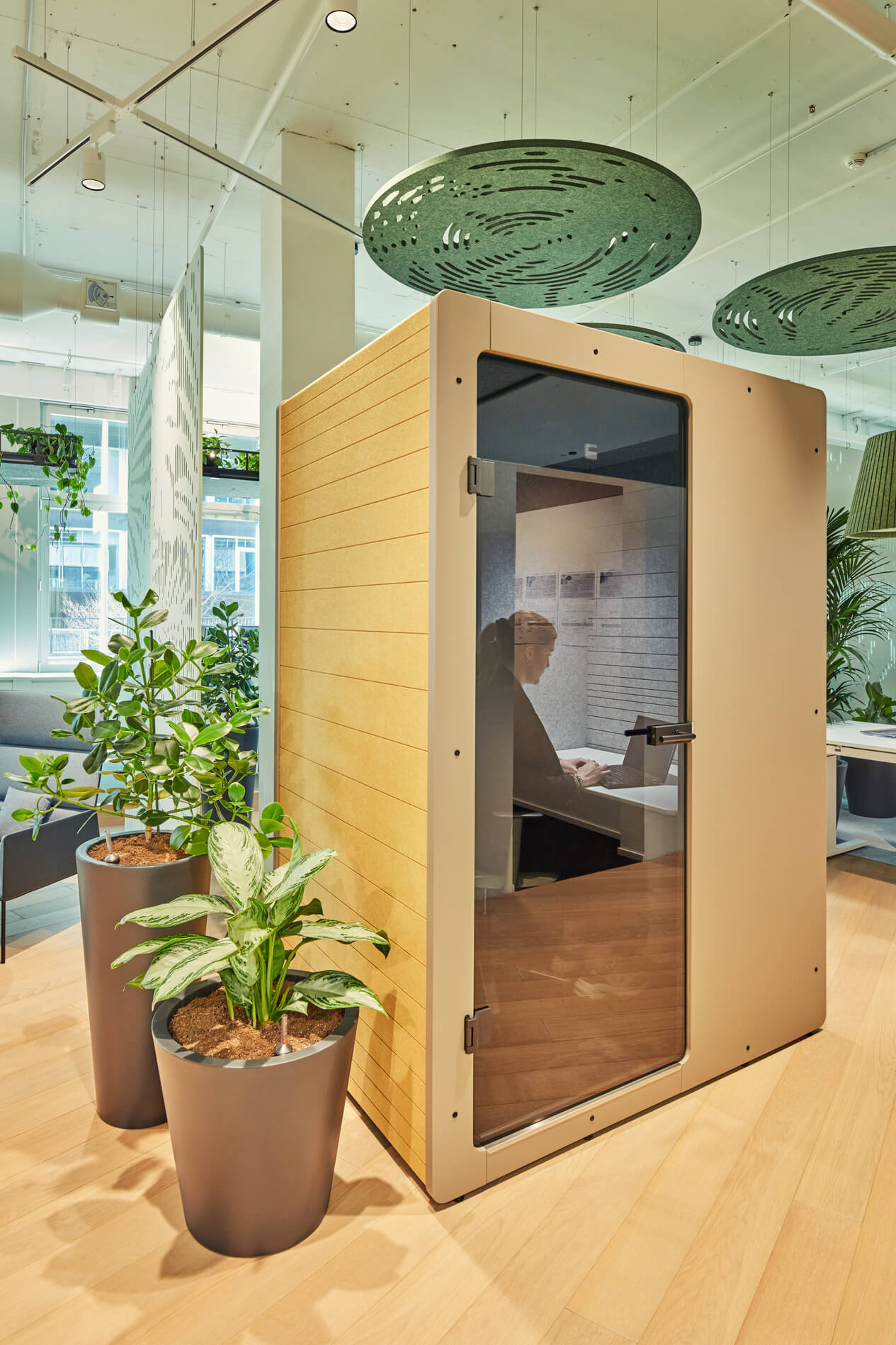 Aan het plafond opgehangen met behulp van discrete kabelsystemen, zweeft Jungle elegant boven haar hoofd terwijl het geluidslandschappen stilletjes verbetert. Kies uit 32 zorgvuldig samengestelde kleuren die aansluiten bij jouw interieurontwerpvisie.
